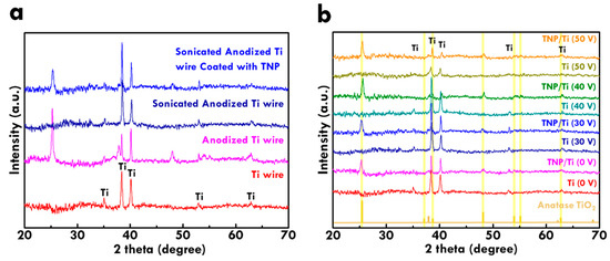 The preparation of Ti wires using the TNT growth and removal technique was further examined from the XRD pattern (Figure 3a). Pure titanium metal signal was observed in the pattern of as-obtained Ti wire. After carrying out the anodization process for Ti wire, the anodized Ti wire shows anatase TiO2 peaks in the pattern, indicating formation of TNT on the surface of the Ti wire. Removal of TNT was conducted by sonicating anodized Ti wires in the DIW and the peaks of anatase TiO2 totally disappeared in the XRD pattern. This phenomenon suggests the successful removal of TNT from the surface. Further coating the TNP layer on the sonicated anodized Ti wire leads to the appearance of anatase TiO2 peaks, which is attributed to the TNP layer. The result of the XRD pattern implies the successful fabrication of pure Ti wire substrate using the TNT growth and removal technique, since there are no extra peaks of titanium metal for the sonicated anodized Ti wire. Furthermore, the composition of TNP/Ti electrodes was examined from the XRD pattern in Figure 3b, where the standard pattern of anatase TiO2 was also shown for comparison. The as-obtained Ti wire is indicated as Ti (0 V) in this figure. Again, the pure titanium peaks were observed in this pattern. With the coating of the TNP layer, the TNP/Ti (0 V) shows consistent peaks of anatase TiO2 owing to the anatase phase nature of the TNP layer.