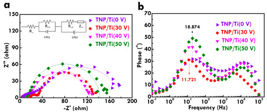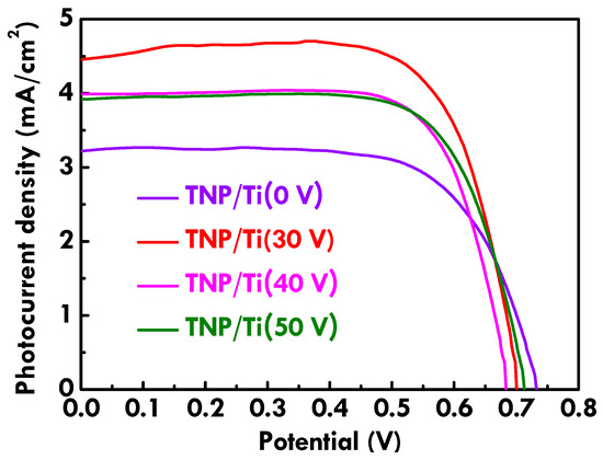 The photovoltaic performance of FDSSC with TNP/Ti wire and TNP/TNT-printed Ti wire photoanodes was further analyzed from LSV curves, as shown in Figure 4. Photovoltaic parameters were listed in Table 1 for clearer comparison. The as-obtained Ti wire without anodization is indicated as Ti (0 V) in this figure. VOC values are similar for all FDSSCs, suggesting the recombination rate is similar for the FDSSC with different substrates for photoanodes. The higher JSC values were obtained for the FDSSC with the TNP/TNT-printed Ti wire photoanodes compared to that for the cell with the TNP/Ti wire photoanode, owing to the TNT imprints on the substrate of the photoanode providing better charge transfer and larger surface area for dye adsorption [22]. The FF values are also higher for the FDSSC with TNP/TNT-printed Ti wire photoanodes, indicating the reduced charge-transfer resistance for these cases with modified substrate for photoanodes. On the other hand, among the FDSSC with TNP/TNT-printed Ti wire photoanodes, the highest JSC of 4.66 mA/cm2 and η of 2.37% were achieved for the cell with photoanode substrate anodized with 30 V. It is inferred that the smallest diameter for the TNT imprints prepared using 30 V could provide the largest surface area for TNP deposition and more routes for transferring charges [22]. Therefore, the best photovoltaic performance was obtained for the FDSSC with the photoanode prepared using substrate pretreated with the smallest anodization voltage. The variation of the anodization voltage cannot only influence the diameter but also the depth of TNT inks. When using an anodization voltage smaller than 30 V, almost no inks can be observed in the SEM images. Therefore, 30 V is the smallest acceptable anodization voltage to create TNT inks on the Ti wire in this study.