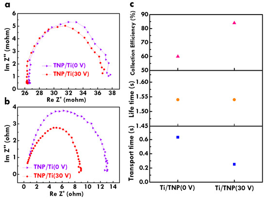 Furthermore, the charge-transfer resistance in the photoanode of the FDSSC with the TNP/Ti wire and TNP/TNT-printed Ti wire photoanodes was examined using a Nyquist plot, as shown in Figure 5a. The equivalent circuit for fitting charge-transfer resistances of the FDSSC was also included in this figure. The charge-transfer resistance at the interface between electrolyte and dye/TiO2/Ti wire (Rct2) which was evaluated by fitting a semicircle in the middle frequency region was also listed in Table 1. The largest Rct2 value of 155 Ω was obtained for the FDSSC with TNP/Ti wire photoanode, probably due to the lack of TNT imprints on the current collector reducing contact between the substrate and TNP layers. On the other hand, the Rct2 value decreases for the FDSSC with the TNP/TNT-printed Ti wire photoanode prepared using smaller voltages for anodization. The smallest Rct2 value of 97 Ω was obtained for the FDSSC with the TNP/TNT-printed Ti wire photoanode prepared using 30 V for anodization. Since the smaller diameter of the TNT imprints can be obtained on the Ti wire anodized using smaller voltage, the smallest diameter of the TNT imprints for the Ti wire anodized using 30 V is favorable for providing the most contacts between substrate and TNP. In addition, the electron lifetime in the FDSSC with TNP/Ti wire and TNP/TNT-printed Ti wire photoanodes was examined by from Bode plot, as shown in Figure 5b. The electron lifetime is inversely proportional to the frequency for the peak at low frequency regions. The FDSSC with the TNP/TNT-printed Ti wire photoanode prepared using 30 V for anodization shows the smallest frequency, indicating the longest electron lifetime for this case. Similarly, the most contacts between current collector and TNP can provide the most sites for charge transfer from the electron generating points to the outer circuit. The longest electron lifetime for the FDSSC with the TNP/TNT-printed Ti wire photoanode prepared using 30 V for anodization is due to the smallest TNT imprints on Ti wire with the most contacts with TNP for providing the most chances for transporting charges. The smallest charge-transfer resistance and the longest electron lifetime for the FDSSC with the TNP/TNT-printed Ti wire photoanode prepared using 30 V are consistent with its highest η value as analyzed from LSV curves in Figure 4. This result suggests that treatments of anodization and ultrasonication for fabricating TNT imprints are beneficial for enhancing the transportation of charges and prolonging the survival of charges in the FDSSC during the illuminating process. Last, electron transfer behavior of the FDSSC with the TNP/Ti wire photoanode and the TNP/TNT-printed Ti wire prepared using 30 V was further analyzed from IMPS and IMVS spectra, as respectively shown in Figure 6a,b. By evaluating electron transport time and electron lifetime, the electron collection efficiency for the FDSSC with the TNP/Ti wire and TNP/TNT-printed Ti wire photoanodes was calculated [26], as shown in Figure 6c. A higher electron collection efficiency was obtained for the FDSSC with TNP/TNT-printed Ti wire photoanode, as compared with that for the FDSSC with the TNP/Ti wire photoanode, due to more contact between the substrate and TNP layer to promote electron collection in the former cases. The higher electron collection efficiency of 84% was obtained for the TNP/TNT-printed Ti wire photoanode prepared using 30 V for anodization, while the cell with TNP/Ti wire photoanode only presented an electron collection efficiency of 60%. This result is again due to the smallest diameter of TNT imprints on Ti wire anodized using the smallest voltage of 30 V for providing more contact points for collecting charges. To more clearly explain the enhanced contact points for charge transfer for the Ti wire treated with anodization and ultrasonication, Scheme 1a,b respectively presents illustration of the charge transfer in FDSSC with the photoanode based on the as-obtained Ti wire and the Ti wire treated with the TNT growth and removal process. With TNT imprints on Ti wire, more contacts between current collector and TNP layer could be obtained and hence more efficient charge transfer could also be achieved for this case. TNT imprints are verified to play important roles on charge transfer in photoanode, and the smaller diameter of TNT imprints is inferred to be more preferable for enhancing contact points between Ti wire and TNP. The study on the design of TNT imprints is expected to further develop to achieve better photovoltaic performance of the FDSSC with flexible Ti wires as the photoanode substrate.