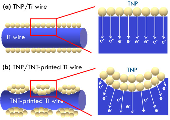 The photoanode of the DSSC plays the most important role in light absorption, charge generation, and transportation [10,11,12,13]. The surface area of the current collector is highly important for determining the contact between the substrate and semiconductor as well as the transfer of charge [14,15,16]. Hydrogen peroxide has been widely used to increase the surface area of metal substrates. Tsai et al. applied H2O2 pretreatment on Ti foils to form networked TiO2 nanosheets to enhance the surface area of the Ti foil [16]. Lee et al. prepared a sponge-like and conformal TiO2 underlayer by using hydrogen peroxide oxidation [17]. An et al. prepared a TiO2 nanoforest underlayer on a Ti substrate using acid and H2O2 treatments for improving the photovoltaic performance of a Ti substrate-based DSSC with higher surface roughness of substrate and better electrical contact between Ti substrate and TiO2 nanoparticles (TNP) [18]. Linnemann et al. used a HNO3 treatment to increase the electrochemically active surface area of the TiO2 layer on Ti foil. The photovoltaic performance of the pertinent DSSC was hence improved [19]. Bialuschewski et al. applied a femtosecond laser structuring technique on titanium substrate to enhance surface area, and overall photoelectrochemical water splitting performance was improved with the treated titanium substrate [20]. Zahran et al. used different amounts of hydrofluoric acid to etch titanium substrates and studied surface area enhancements [21]. However, extra TiO2 nanomaterials should be coated on the current collector and, hence, more interfaces could be developed to increase charge-transfer resistance. In our previous work, the current collector was modified using the TiO2 nanotube (TNT) growth-removal process [22,23]. The TNT can also be used as the dye-adsorbing layer in other works [24,25]. The modified Ti foil was applied for sputtering Pt as the counter electrode for the normal-type DSSC. Due to the larger surface area of substrate for the counter electrode, a better catalytic ability for redox reactions in electrolyte was achieved and, hence, higher power conversion efficiency was obtained for the resulting DSSC. Based on this concept, the surface area of Ti wire and hence contact between the TNP layer and the Ti wire substrate are expected to be enhanced by using the unique TNT growth-removal technique for facilitating charge transfer.