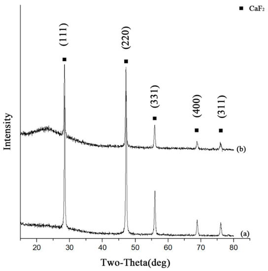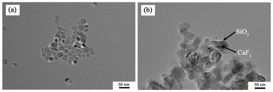 Figure 1 shows the XRD patterns of the as-prepared CaF2@SiO2 nanoparticles and pure CaF2 nanoparticles. Figure 1a shows the XRD patterns of CaF2 nanoparticles. All the discernible peaks were in good agreement with the data of pure cubic CaF2 crystals (JCPDS NO.35–0816). The diffraction peak of CaF2 crystals was narrow and sharp, which indicated that the prepared CaF2 had high crystallinity, and no impurity peak was detected, indicating that the prepared CaF2 had high purity. As shown in Figure 1b, the XRD patterns of CaF2@SiO2 nanoparticles were the same as the XRD patterns of pure cubic CaF2 crystals; only at about 2θ = 20°–25°, the pattern for CaF2@SiO2 had a low and wide peak, attributed to a silica dioxide amorphous halo [37,41].