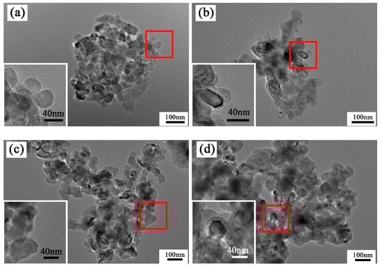 TEM images of CaF2@SiO2-coated powder with different amounts of TEOS are shown in Figure 4. The amount of CaF2 was 1 g, the pH value was 8.5, and the amounts of TEOS were 1 mL, 2 mL, 3 mL, and 4 mL. The white framed images are partial enlarged views of the red selected areas. Figure 4a shows the powder obtained when 1 mL of TEOS was added; it can be seen from the figure that this TEOS amount resulted in less amorphous SiO2. At the edge of nano CaF2, the thickness of the SiO2 shell was very small, about 1.2 nm. When the amount of TEOS added was increased to 2 mL (Figure 4b), the thickness of the SiO2 shell coated on the nano-CaF2 increased to about 3.6 nm, but the coating effect was poor, and the thickness of the SiO2 shell was uneven. As shown in Figure 4c, when the amount of TEOS added was 3 mL, the thickness of the SiO2 shell increased to about 5.8 nm. At the same time, it can be seen that the amorphous SiO2 coated on CaF2 had uniform thickness and a good coating effect, but slight agglomeration occurred. When the amount of TEOS further increased to 4 mL, the thickness of the SiO2 shell reached about 13.3 nm, the coating thickness was relatively uniform, but agglomeration was more pronounced. The thickness of the SiO2 shell coated on CaF2 increased with the increase of the amount TEOS, but when the amount of TEOS added was too large, agglomeration occurred, whereas when the amount of TEOS was 3 mL, the best coating effect was obtained. SiO2 shells with different thicknesses could be obtained by changing the amount of TEOS added, and the thickness of the SiO2 shell could be controlled between 1.5 and 15 nm.