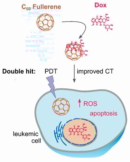 C60-Dox nanocomplex for photodynamic chemotherapy: C60 delivers Doxorubicin (Dox) into leukemic cells and intensifies its accumulation; following internalization, the drug is anticipated to be released from the nanocomplex; cancer cell is exposed to the double cytotoxic hit from both photoexcited C60 (photodynamic therapy, PDT) and co-delivered Dox (improved chemotherapy, CT).
