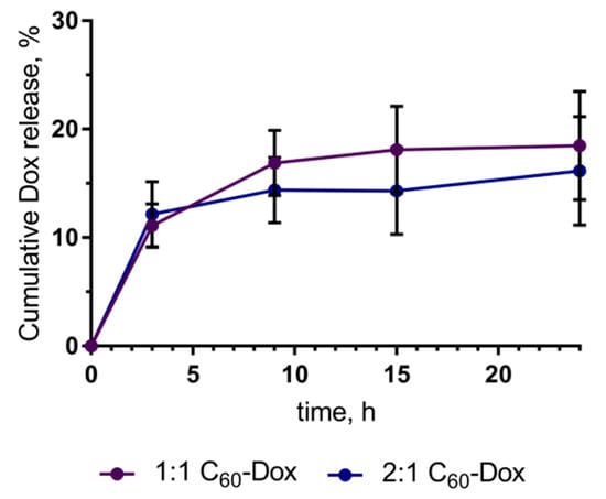 Dox release from C60-Dox nanocomplexes during 24 h of incubation in Roswell Park Memorial Institute (RPMI 1640) medium.