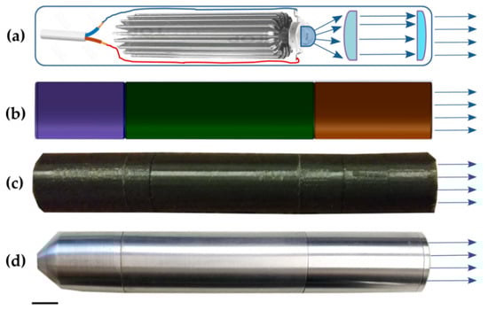 LED light system: (a) scheme, that reveals its electrical part, LED, and optical system, (b) design of the mounting carcass in 3D Software SOLIDWorks (Dassault Systems, Vélizy-Villacoublay, France), (c) 3D printed plastic 1st model, (d) final metal model; scale bar corresponds to 10 mm.