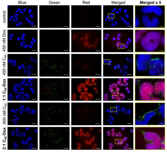 Fluorescence microscopy images of CCRF-CEM cells, stained with 4′,6-diamidine-2′-phenylindole dihydrochloride (DAPI, Blue), fluorescein isothiocyanate-based immunostaining for C60 (Green) and Dox (Red) after treatment with: 450 and 900 nM C60, 450 nM Dox, 1:1 or 2:1 C60-Dox nanocomplex. The white scale bar corresponds to 20 µm; the yellow scale bar on images in the column “Merged x5” corresponds to 4 µm.