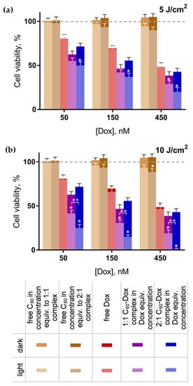 Viability of CCRF-CEM cells: cells were treated with either C60 and Dox alone or C60-Dox nanocomplexes in Dox equivalent concentrations and incubated in the dark or after light irradiation with 405 nm LED at 5 J/cm2 (a) or 10 J/cm2 (b) (* p ≤ 0.01 in comparison with the respective dark control, ** p ≤ 0.01 in comparison with the photoexcited 1:1 nanocomplex).