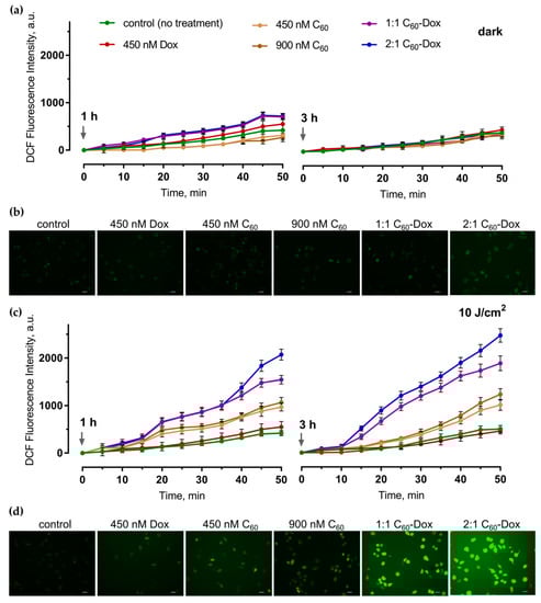 The efficient and continuous intracellular ROS production is considered to be a critical step in realization of a photoexcited C60 anticancer effect [31,36,40,56,57]. ROS generation in cells was evaluated with the use of the fluorescence dye DCFH-DA [58,59] at 1 and 3 h of incubation after light irradiation or in the dark. The minor increase of the fluorescence signal was detected during the incubation of the control untreated cells (Figure 6). No reliable changes in ROS generation in comparison with the control were observed when 450 or 900 nM C60 was applied alone. Treatment with the free 450 nM Dox or C60-Dox nanocomplexes was followed by a slight increase of ROS generation at 1 h that was attenuated at 3 h (Figure 6a). When cells treated with the free C60 or C60-Dox nanocomplexes were irradiated with 405 nm light at 10 J/cm2 fluence the ROS production was intensified at both 1 and 3 h. In cells treated with 1:1 or 2:1 C60-Dox nanocomplex ROS levels at 3 h after irradiation exceeded the control level by 3.8 times and 5.0 times, correspondingly (Figure 6c).