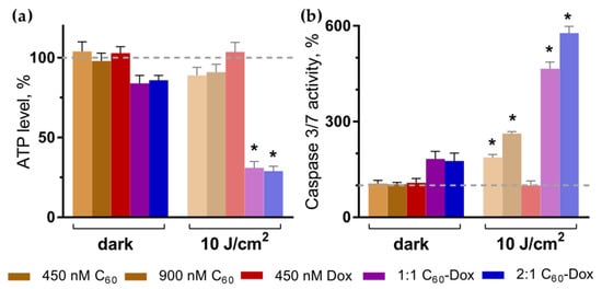 ATP level (a) and caspase 3/7 activity (b) in CCRF-CEM cells at 3 h after treatment. Treatment was done with either free C60 and Dox or C60-Dox nanocomplexes in the dark or after irradiation with 10 J/cm2 405 nm LED (* p ≤ 0.01 in comparison with the respective dark control).