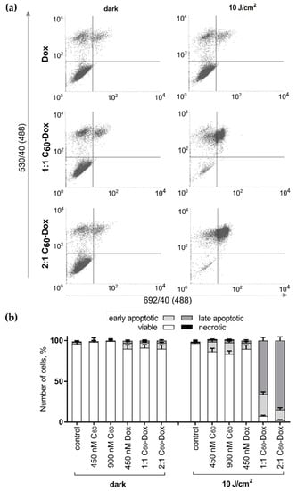 Finally, we checked the exposure of phosphatidylserine on the cell surface as an “eat me” signal, that induces phagocytic recognition and destruction of apoptotic cells [62]. To differentiate apoptotic cells fluorescence activated cell sorting (FACS) was used. On FACS histograms (Figure 8) the cell distribution at 6 h after the treatment with either free C60 or Dox or C60-Dox nanocomplexes is presented according to the green and red fluorescence intensities of Annexin V-FITCI and PI respectively. Viable (Annexin V-FITC negative, PI negative), early apoptotic (Annexin V-FITC positive, PI negative), late apoptotic (Annexin V-FITC positive, PI positive), and necrotic (Annexin V-FITC negative, PI positive) cells in their quantitative populations analyses are presented in Figure 8b. Neither treatment with C60 nor 405 nm light irradiation alone had a significant effect on cell distribution profiles (FACS histograms are not shown). A slight increase in the number of early apoptotic cells was observed after treatments with free Dox, C60-Dox nanocomplexes or photoexcited C60. When cells treated with C60-Dox nanocomplexes were exposed to light a distribution-shift towards late apoptosis was observed. Thus, the content of Annexin V-FITC positive and PI positive cells in population of cells treated with photoexcited 1:1 and 2:1 C60-Dox nanocomplexes reached 93% and 96%, correspondingly (Figure 8).