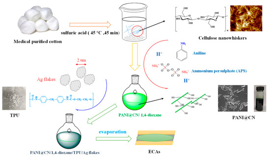 In order to alleviate the above two problems, we report a facile method to prepare polyaniline (PANI)/cellulose nanowhiskers (PANI@CNs) as novel nanocomposites that possess a high aspect ratio (defined as the ratio of length to diameter; the aspect ratios of PANI@CNs were about 10–15) and excellent solubility in 1,4-dioxane (nearly 5 mg/mL). Cellulose nanowhiskers (CNs) are of the most promising biomaterials derived from natural cellulose fibers [28]. They have received extensive interest due to their distinctive characteristics like high-aspect-ratio, regulatable morphologies, and excellent dispersity in conventional solvents [29,30]. CNs characteristics make cellulose nanowhiskers excellent templates to support the stabilization of PANI with a high aspect ratio and high conductive composites. A large number of researches have been devoted to the synthesis of a wide variety of cellulose-based conductive polymer materials, which are widely used in the fields of supercapacitors, electromagnetic shielding, and drug release [31,32,33,34]. However, to the best of our knowledge, the introduction of PANI@CN as a way to reach superior electrical conductivity with the low fabricating cost of conductive adhesives has not been reported. In this study, a layer of conductive PANI was polymerized in situ on CNs templates to construct high-aspect-ratio conductive fillers. The formed PANI@CNs nanocomposite with Ag flakes was then dispersed into thermoplastic polyurethane (TPU) resin to fabricate hybrid ECAs by a simple solution mixing method. These PANI@CNs nanocomposites are expected to locate in the interfaces between adjacent Ag flakes and exhibit 3D hierarchical conductive networks for improving the conductivity of the ECAs. Therefore, new flexible conductive adhesives with ultrahigh conductivity and high mechanical compliance were achieved.