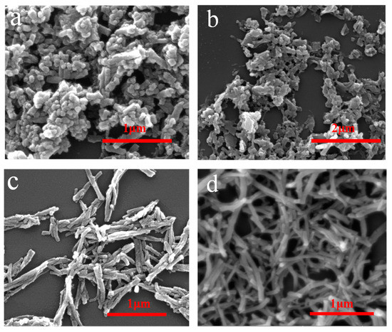 The morphologies of PANI@CNs with different CNs/aniline weight ratios are given in Figure 3. It was found that when there is no cellulose in the reaction mixture, the obtained polyaniline is in the form of globular particles (Figure 3a). When cellulose was gradually added in the reaction mixture, PANI@CNs nanocomposites that possessed rod-like shapes were obtained. When the weight ratio of the CNs/aniline weight ratio is 1/6, the small number of cellulose nanocrystals is difficult to adequately react with the excess of the aniline monomer, resulting in the formation of irregular complexes and a large amount of PANI nanoparticles (Figure 3b). By increasing the CNs mass ratio to 1:4, more uniform PANI@CNs nanowhiskers with thicker shells formed. Moreover, the nanocomposites are well dispersed and exhibited a short rod-like shape (Figure 3c). Aggregations of PANIs on a large scale were not observed. When the ratio of CNs/aniline further increased to 1:2, PANI@CNs nanowhiskers did not change obviously (Figure 3d). However, it is worth noting here that the resistivity of PANI@CNs nanowhiskers increased because of the higher proportion of non-conductive CNs, which will be discussed in the later section.