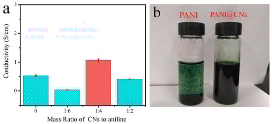 (a) Electrical conductivity of PANI@CNs with different feeding mass ratios of CNs/aniline, (b) dispersion test of PANI, and PANI@CNs (1:4) in 1,4-dioxane.