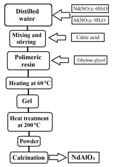 The catalyst synthesis was carried out based on the method proposed by Pechini for the synthesis of nanoparticles [25]. All other chemicals were purchased from Sigma-Aldrich (Saint Louis, MO, USA) and used without further purification. The synthesis process consisted of the formation of a polymeric resin due to the polyesterification between a metal complex (citric acid–metal ion) and a polyvalent alcohol, such as ethylene glycol. In this process, a homogeneous distribution of the metal ions into the structure of the formed resin was obtained, thus limiting its ionic mobility and its close contact. This spatial distribution favors the formation of a finely dispersed homogeneous phase after its calcination [26,27]. One of the main advantages of this process is its better control of the stoichiometry, lower reaction temperatures, less contamination, and better capability to prepare both ultrafine powders and thin films [27]. Figure 1 shows the process for the synthesis of the catalyst used in this work (NdAlO3).