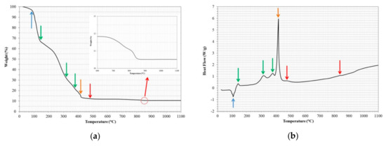 According to the figure, it was an endothermic peak around 105 °C with a mass loss of approximately 5% (evaporation of adsorbed water). Subsequently, three small exothermic peaks were observed at 142 °C, 316 °C, and 377 °C that were associated with an additional mass loss of approximately 80% (breakdown of the polymer gel and release of water, carbon dioxide, and nitrogen oxides [31,32]). At 416 °C, a big exothermic peak associated with an additional mass loss of approximately 2% occurred (complete destruction of the organic skeleton [26,31,32,33]). Finally, at 476 °C and 838 °C, two small exothermic peaks were observed, associated with a small loss of mass close to 1.0% (both peaks were associated with the combustion of residual carbon and the decomposition of oxycarbonates of mixed metals, respectively, resulting in the formation of the stable phase of the desired compound [26,31,32]).