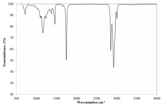 Figure 16 shows the FTIR spectra of the biodiesel synthesized in the presence and absence of the catalyst at 200 °C for 6 h. Due to the structural similarity that exists between triglycerides and methyl esters, the spectra of both are similar [11]. In the spectra, the characteristic peak of the carbonyl group of the methoxyesters (–CO–OCH3) was observed at ≈1743 cm−1, which has been used to confirm the conversion of the oil to biodiesel [45,46]. The only visible difference in both spectra was the presence of a broad band associated with the glycerol alcohol group at ≈3465 cm−1. This suggested the presence of mono- and diacylglycerides formed during the transesterification process, and their presence was lower in the biodiesel synthesized with the catalyst.