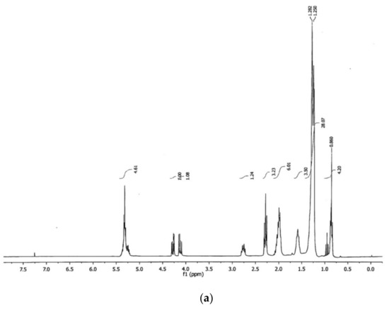 Similarly, the 13C NMR spectra showed much similarity to that of the canola oil (Figure 6b). It has been reported that carbon signals were grouped in five main spectral regions [45,49]. These regions involved the carbonyl atom region (–COOR) detected at ≈175 ppm, the region of carbon atoms associated with double bonds (–C=C–) at ≈130 ppm, the carbon atoms of the methyl ester groups (–OMe) at ≈50 ppm, the methylene group region at ≈20–35 ppm, and the terminal methyl group region (–CH3) of the hydrocarbon chains at ≈14 ppm. Furthermore, the presence of the characteristic peaks corresponding to the carbonyl ester (–COO–) and C–O were found at 172–175 and 51.35 ppm, respectively, which confirmed the presence of the methyl esters [46,48]. Additionally, the peaks between 127–132 ppm indicated the insaturations in the methyl esters, the peak in 14 ppm was due to the terminal carbon of the methyl groups, and the signals between 22–34 ppm were related to the long chain methylene carbons of the methyl esters of fatty acids [46,48].