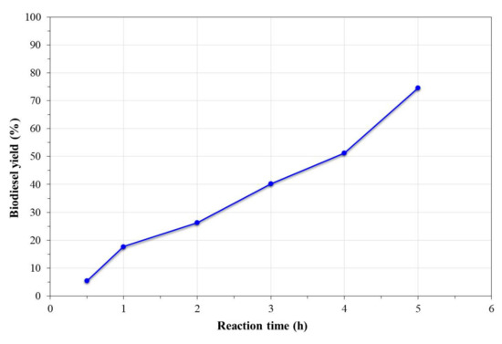 Figure 9 shows the effect of the reaction time on the biodiesel yield obtained at the optimum conditions of transesterification, methanol:oil mass ratio of 6:1, and temperature of 200 °C. From the graph, it was observed that in the reaction time evaluated, the conversion kinetics were linear; this indicated that at higher reaction times, the biodiesel yield could increase or reach the steady state at higher yields than the last value obtained. As already described, this tendency could be due to the high reaction pressure that favored the oil:methanol miscibility and the contact with the catalyst, thus reducing the mass transfer resistance.