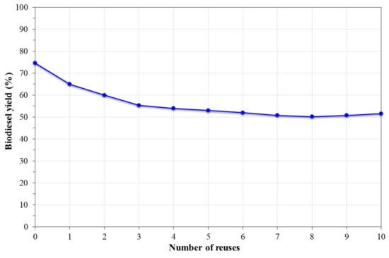Two factors are important in order to define the viability of a catalyst for the synthesis of biodiesel: its recyclability and stability [44]. Figure 10 shows the biodiesel yield obtained based on the number of reuses of the catalyst at a methanol:oil mass ratio of 6:1 and a reaction time of 5 h at 200 °C. From the graph, it was observed that there was a constant decrease in the activity of the catalyst until six reuses, and then this remained constant at around 50% conversion. This implied a reduction of 34% of the catalytic activity of the catalyst. The decrease in catalytic activity has been associated with the loss of active sites on the catalyst’s surface [1,19].