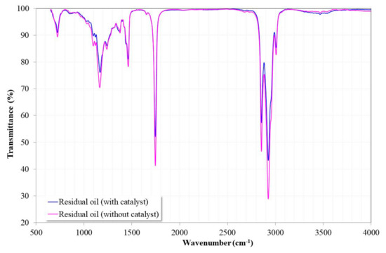 However, in the case of residual oil in the presence of the catalyst, it was possible to observe a broad shoulder at 3467 cm−1. In the case of residual oil without the catalyst, this band was smaller. It has been indicated that its presence may correspond to the alcohol group (OH), oxydryl (OH–), or hydrogen bonding [11,45]. The presence of this signal can be associated with the alcohol groups of the glycerol, that is, mono- and diacylglycerides are present in the oil due to the incomplete transesterification of the triacylglycerides. Due to the higher reaction rate, it is understandable that in this case, their presence was detected.