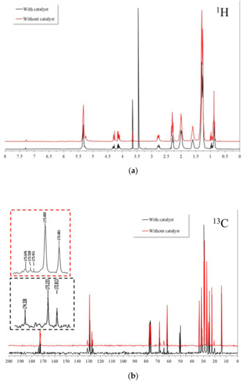 NMR spectra of the residual canola oil after the transesterification process with and without the catalyst: (a) 1H and (b) 13C (solvent used: CDCl3).