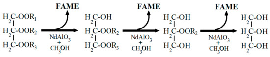 Schematic transesterification of canola oil with methanol and NdAlO3 as the catalyst (FAME = fatty acid methyl esters).