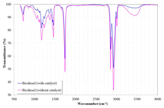 FTIR spectra of the biodiesel synthesized with and without the catalyst.