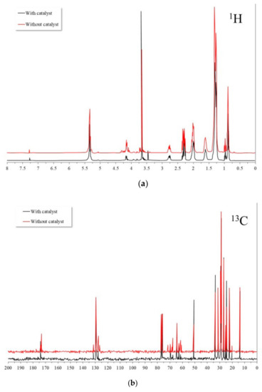 NMR spectra of the biodiesel synthesized with and without the catalyst: (a) 1H and (b) 13C (solvent used: CDCl3).