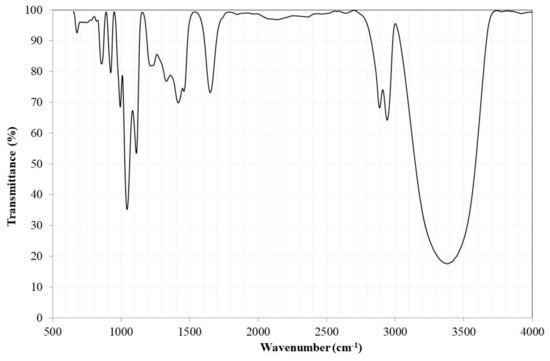 Figure 18 shows the FTIR spectrum of the crude glycerol obtained as a reaction byproduct of the transesterification process via heterogeneous catalysis of the canola oil at 200 °C for 6 h. The FTIR spectrum was identical to others reported in the literature [14,50]. It was possible to identify the peaks assigned to the superposition of the C–H and OH bending planes of the glycerol molecule (≈1200–1500 cm−1), in addition to the presence of the OH group at ≈3500–3000 cm−1 and ≈1650 cm−1 [50]. This showed the high purity of the crude glycerol obtained by the heterogeneous transesterification process. This is a great advantage if it is considered that in the case of the homogeneous transesterification process, the crude glycerol may contain methanol, water, salts, free fatty acids, soaps, methyl esters of fatty acids, and glycerides. This has meant that due to the high cost of its purification process, it is preferable not to recover it [13,14]. Therefore, the synthesis process of biodiesel via heterogeneous transesterification offers a great advantage by reducing the production costs due to the high purity of the products and byproducts generated.