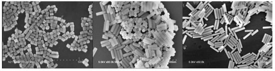 Three SEM images of NaYF4 NPs (from left to right NR13, NR12 and NR11).