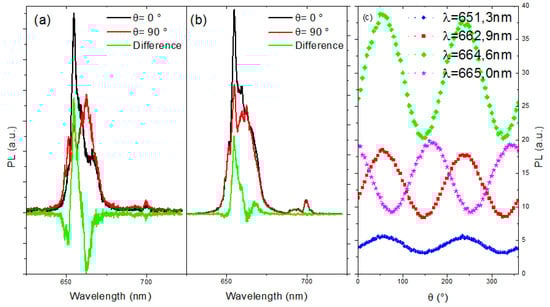 (a,b) Spectrum for two orthogonal polarizations (red and black) and the difference between them (green) for two different nanoparticles (NPs) of the same batch NR07. (c) PL intensity versus polarization for different wavelengths.