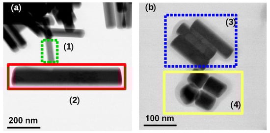 TEM observations evidences two situations. On one hand, we sometime observe in the same batch two (or more) populations of NPs, each one having a relatively low size dispersion. However, the size of each population can be very different as it is illustrated in Figure 3 for two syntheses (NR11 and NR13). The EDX measurements of the delimited area give us the chemical composition as reported in the Table 3. For each population, we measure a strong difference in the gadolinium concentration (and in consequence the yttrium concentration) while erbium and ytterbium concentrations present only small variations. In Figure 3a, the NP in the area (1) delimited by the dotted green line area has a concentration of gadolinium of 32 mol% and its size is typical from this synthesis (50 × 260 nm), while the NP shown by the continuous red line (area 2) has a concentration of only 18 mol% and its size is twice the average size (110 × 650 nm) with a similar aspect ratio. Another example for the batch NR013 is presented in Figure 3b where the same behavior is observed with a complete different aspect ratio. While the experimental conditions are exactly the same, one (NR00) or two populations of particle sizes (NR11) are observed, with identical aspect ratios (about 6). At this stage, no clear parameter can explain these results but this is probably an evidence that the two kind of particles formed at different time during the synthesis, probably because the kinetic of formation of Gd rich or Gd poor particles is different.