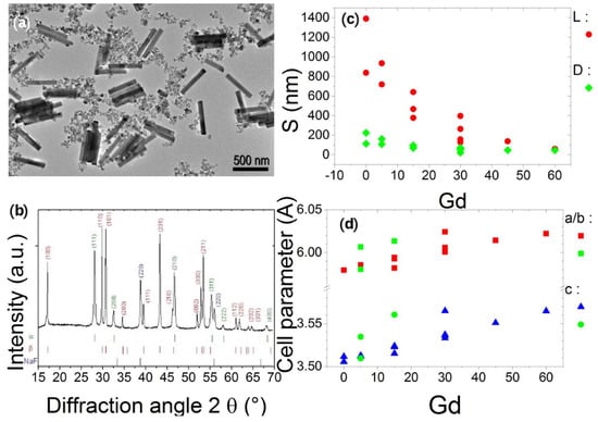 NaYF4 nanoparticles (a) Transmission Electron Microscopy (TEM) image with small cubes (-NaYF4) big nanorods (-NaYF4) NR01 (b) typical X-ray pattern of these particles (c) TEM NPs sizes S (L = lenght, D = diameter) and (d) cell parameter dependences vs Gd nominal doping with blue triangles and red squares for the main set of cell parameters of each batch and green squares and green circles for the second set of cell parameters.