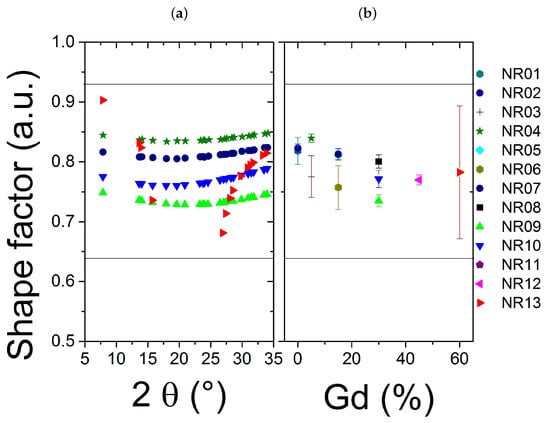 The Figure 5a presents the dependence of the shape factor for four typical samples (NR 04-07-09-10) and the most different one (NR13), all the peaks show a shape factor between Gaussian and Lorentzian limits. The shape factor may not correlated with the Gd concentration (Figure 5b) To understand the origin of the broadening of our peaks, possibly due to both size and microstrain contribution, the Halder-Wagner method [,] is recommended with such profile parameters instead of a Williamson-Hall approach [], as the peaks have not a pure Lorentzian shape. Note that the fit is not so dependent on the range, even if Halder-Wagner plot insists on the small values (however the most intense peaks).