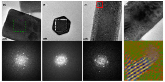 As previously said, the smallest length of the crystallites is associated to the directions orthogonal to c-axis. Moreover, for NPs with a diameter below 100 nm, this length is almost always slightly smaller of few nanometers than the diameter of the NPs. This fact was explained with the HRTEM observation. In Figure 7a,b, we observed an amorphous phase or a less crystallized shell around the NPs. Another observation, more surprising from our point of view, is the possibility to have a well crystallized phase in an orthogonal direction surrounding the core of the NPs. The inset of Figure 7a shows the FFT of the area delimited by the dotted green line. This FFT presents a rectangular signal characteristic from an hexagonal structure seen orthogonally of the c-axis. Even though the NPs in Figure 7c is a rod well defined, the FFT of the area delimited by the continuous red line is characteristic from an hexagonal phase through the c-axis. Note that the crystallinity of the NPs presented is not altered by the electron beam of the TEM.