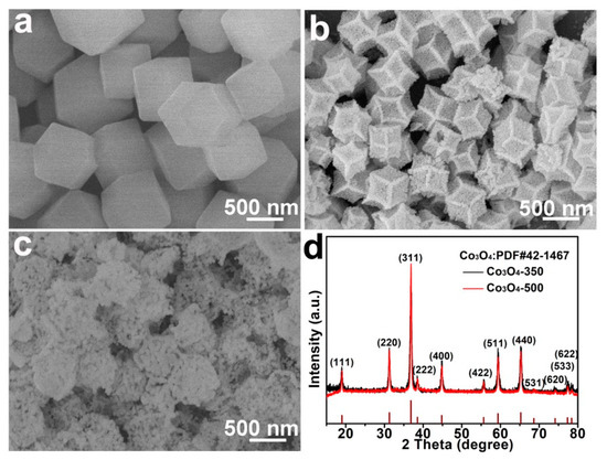 Typical SEM images of the Co-based zeolitic-imidazolate frameworks (ZIF-Co) polyhedron (a), the Co3O4-350 polyhedron (b), and the Co3O4-500 polyhedron (c); The XRD patterns (d) of both the Co3O4-350 polyhedron and the Co3O4-500 polyhedron.