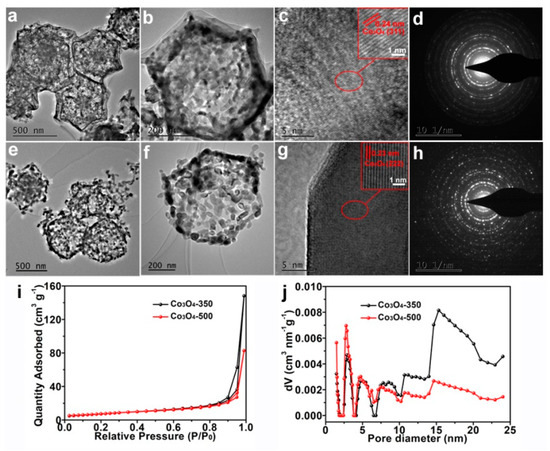Typical TEM images of both the Co3O4-350 polyhedrons (a,b) and the Co3O4-500 polyhedrons (e,f); The HRTEM images of both the Co3O4-350 polyhedrons (c) and the Co3O4-500 polyhedrons (g); The SAED pattern of both the Co3O4-350 polyhedrons (d) and the Co3O4-500 polyhedrons (h); N2 absorption–desorption isotherms (i) and pore-size distributions (j) of the Co3O4-350 polyhedrons and the Co3O4-500 polyhedrons.