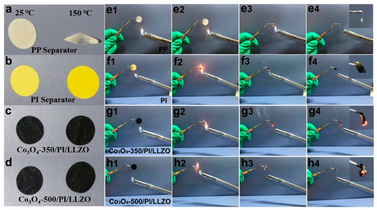 The thermal stability (a–d) and Flame-retardant properties (e–h) of the polypropylene (PP) separator, polyimide (PI) separator, Co3O4-350/PI/LLZO separator and Co3O4-500/PI/LLZO separator.