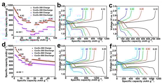 The rate capability of Li–S cell using varied separators at room temperature (a) and 80 °C (d). The galvanostatic charge/discharge profiles of Li–S cell using Co3O4-350/PI/LLZO separator at room temperature (b) and 80 °C (e). The galvanostatic charge/discharge profiles of Li–S cell using Co3O4-500/PI/LLZO separator at room temperature (c) and 80 °C (f).