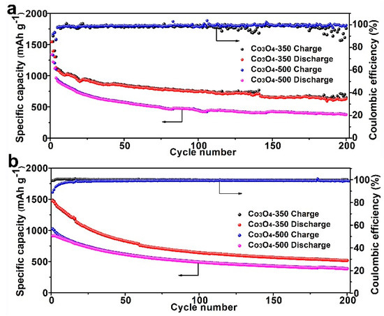 The room-temperature and elevated temperature cycling performances of Li–S cells using varied separator are tested and shown in Figure 6. At room temperature, Li–S cells using the Co3O4-350/PI/LLZO separator display an initial high specific capacity of 1132 mAh g−1 at a current density of 0.1 C, which gradually decreases to 630 mAh g−1 after 200 cycles. While for Li–S cells using the Co3O4-500/PI/LLZO separator, they show a high initial capacity of 964 mAh g−1, which reduce to a relatively lower value of 376 mAh g−1 after 200 cycles, indicating the relatively poor cycling properties. It is worth noting that after several initial cycles the Coulombic efficiencies of both cells reach almost 100% during the repeated charge–discharge processes, illustrating the high reversibility. At an elevated temperature of 80 °C, a higher capacity retention of 516 mAh g−1 is obtained for Li–S cells using the Co3O4-350/PI/LLZO separator. These above results clearly reveal the better cycling stability and high temperature durability of the as-constructed Li–S cells using Co3O4-350/PI/LLZO separator.