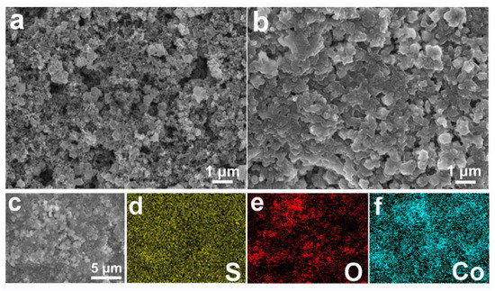 In order to investigate the polysulfide blockage effect of the Co3O4-350/PI/LLZO separator, typical SEM images and the corresponding EDS-mapping images have been provided. As for the pristine separator, the Co3O4-350 polyhedron is homogeneously distributed throughout the whole separator as shown in Figure 7a. After cell cycling, the surface of the Co3O4-350/PI/LLZO separator is covered by a thin layer consisting of solid-state polysulfide-containing speciation as indicated in Figure 7b. Surprisingly, the polyhedron morphology of the Co3O4-350 particle does not change even after cell cycling, possessing the enduring effect on physically blocking the soluble polysulfides. The corresponding EDS-mapping images of the cycled Co3O4-350/PI/LLZO separator as shown in Figure 7c–f indicate that the sulfur-containing species are detected after cell cycling and the Co3O4-350 polyhedron remains un-pulverized due to the element signal overlap in Figure 7e,f. These results show that the robust and reliable Co3O4-350 polyhedron on the Co3O4-350/PI/LLZO separator can effectively block the diffusion of soluble polysulfide species without dramatic microstructure deformation.