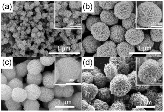 The FESEM images of the as-prepared TiO2 hierarchical nanospheres under different solvothermal reaction times: (a) 6 h, (b) 12 h, (c) 24 h, and (d) 48 h.