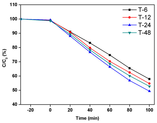 The photocatalytic properties of TiO2 hierarchical nanospheres prepared under different solvothermal reaction times were investigated through the photodegradation of MB under Xe lamp irradiation, as shown in Figure 5, where C is the concentration of MB at irradiation time t and C0 is the initial concentration of MB. In the dark adsorption process, the TiO2 hierarchical nanospheres prepared under different times almost exhibit the same adsorption capacity for MB. Under light irradiation, it is clear that the TiO2 hierarchical nanospheres prepared at 6 h degrade 42.1% MB within 100 min. However, as the solvothermal time increases, the photocatalytic degradation activity of TiO2 hierarchical nanospheres first increases and then decreases. When the solvothermal time is 24 h, the TiO2 hierarchical nanospheres degraded up to 50.6% MB. The initial enhancement of photocatalytic degradation activity might because the diameter of the TiO2 hierarchical nanospheres gradually increases and more high-energy {001} facets are exposed with the increase of solvothermal reaction time (Figure 2), which increases the number of surface active sites and improves light scattering ability, thereby enhancing the surface adsorption ability of MB, absorbing more incident photons to generate more electron–hole pairs and finally enhancing the degradation of adsorbed MB. However, when the solvothermal reaction time exceeds 24 h, the TiO2 hierarchical nanospheres will be etched, resulting in the decrease in photocatalytic degradation activity.
