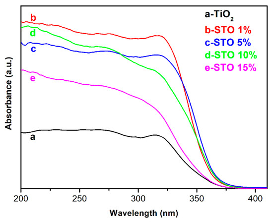 The UV-vis absorption measurements were performed on the TiO2 and STO hierarchical nanospheres as a function of Sn4+ doping concentration to evaluate the effect of Sn4+ doping on the light absorption properties of the samples. It can be seen from Figure 10 that the light absorption intensities of the STO hierarchical nanospheres (curves b–e) are higher than that of the pristine TiO2 hierarchical nanospheres (curve a), and the absorption edges of the STO samples (curves b–e) shift toward longer wavelengths (370 nm) compared to the pristine TiO2 UV-vis pattern (355 nm). These phenomena should be due to the fact that Sn4+ doping forms an impurity level at 0.38 eV below the conduction band (CB) of TiO2 [33], which can promote the excitation of electrons in a subsection from the valence band (VB) to the impurity level and then to the CB. The STO hierarchical nanospheres need to absorb light energy during each electronic transition, resulting in the increase in their light absorption intensities. Meanwhile, the energy level width of electron transition in STO hierarchical nanospheres is smaller than the band gap of TiO2, therefore Sn4+ doping broadens the light absorption range of samples. However, among the STO hierarchical nanospheres, with the increase of Sn4+ doping concentrations, the wavelength of absorption edges first increase and then decrease. This phenomenon should be ascribed to the fact that the Sn4+ doping will significantly improve the light absorption capacity of STO hierarchical nanospheres, however, the proportion of nanosheets in the hierarchical nanospheres gradually decreases as the Sn4+ doping concentration increases (Figure 6), which will reduce the light scattering ability of the samples. Therefore, when the molar ratio of nSn/nTi is 5%, the STO hierarchical nanospheres exhibit the greatest absorption edge with a value of 370 nm. In addition, the PL spectra of TiO2 (24 h) and STO (0.5 mmol) hierarchical nanospheres was measured to further explore the effect of Sn4+ doping on the separation of electron–hole pairs, as shown in Figure S1. It is clear that the PL intensity of STO (0.5 mmol) is obviously lower than that of TiO2 (24 h), indicating that STO (0.5 mmol) has a better separation efficiency of electron–hole pairs than TiO2 (24 h), which is very beneficial for improving the photocatalytic performance [34,35].