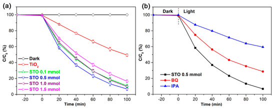 To further explore the photocatalytic reaction mechanism and identify the primary active radical species during the photodegradation processes, the radical trapping experiments were conducted using IPA as the scavenger for ·OH and BQ as the scavenger for O2−, as shown in Figure 11b. It can be seen clearly that the photodegradation of MB remarkably decreases after that IPA is added as a ·OH scavenger, which indicates that ·OH is the primary active radical species during the photocatalytic degradation processes of MB. Compared with IPA, the photodegradation of MB also diminished after the addition of BQ as an O2− scavenger, but not as so much as that of IPA, which suggests that the O2− radicals play a more minor role than the ·OH radicals during the photodegradation processes of MB [34,35]. In addition, the photocatalytic tests using the best STO (0.5 mmol) hierarchical nanospheres with various amounts (15, 25, and 35 mg) were done to investigate the loading effect of catalysts for the degradation of MB (see Figure S2). The results indicate that the STO (0.5 mmol) hierarchical nanospheres show the best photocatalytic performance at the loading of 25 mg. The overloading of catalysts will negatively affect the degradation efficiency of MB, possibly because of the agglomeration of catalysts leading to a reduction in active sites on the surface of catalysts [35].