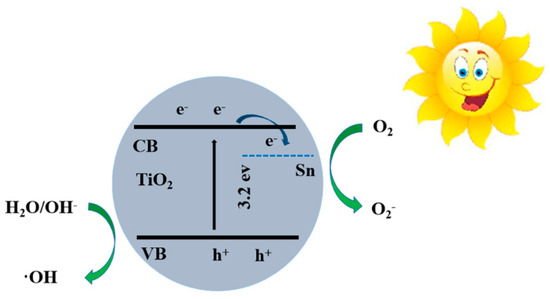 The possible mechanism of enhanced photocatalytic activity of STO hierarchical nanospheres with a 5% molar ratio of nSn/nTi has also been investigated, as shown in Figure 12. Under the illumination of light, the electrons are transported from the VB to CB of TiO2, leaving holes in the VB. The photogenerated electrons will react with O2 to form O2−, while the photogenerated holes will react with H2O and OH- to form the ·OH, then the O2− and ·OH will further degrade or oxidize the MB on the photocatalyst surface [4]. It can be seen that increasing the specific surface area, enhancing the generation efficiency of charge carriers, and reducing the recombination rate of photogenerated electron–hole pairs will be beneficial to improve photodegradation activity of TiO2 photocatalysts. Therefore, the improvement of the photocatalytic activity of STO hierarchical nanospheres with a 5% molar ratio of nSn/nTi is mostly attributed to the following four aspects. (1) The exposed highly reactive {001} facets of STO hierarchical nanospheres with an appropriate molar ratio of nSn/nTi (5%) is similar to that of original TiO2 samples, which will provide more active sites to degrade the adsorbed MB; (2) Compared with the original TiO2 hierarchical nanospheres, the absorption spectrum of the STO samples has been broadened due to the Sn4+ doping, which greatly raised the utilization rate of solar energy, thereby generating more electron–hole pairs; (3) Since the Sn4+ doping level is 0.38 eV under the CB [36], the photogenerated electrons can be directly transferred to the surface of the photocatalyst through the Sn4+ doping level, resulting in efficient separation of photogenerated charge carriers; (4) After Sn4+ doping, the surface hydroxyl group content of STO is greater than that of pure TiO2, which will effectively prevent the recombination of photogenerated electron–hole pairs, prolong the carrier lifetime, improve the separation efficiency of photogenerated charge carriers and increase the probability of photogenerated charge carriers participating in photocatalytic reactions [40], thereby leading to an excellent photocatalytic performance.