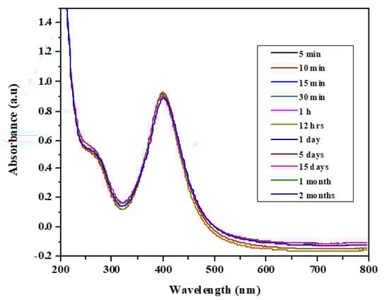 UV-Vis spectra of biosynthesized Ag nanoparticles (AgNPs) showing their stability.