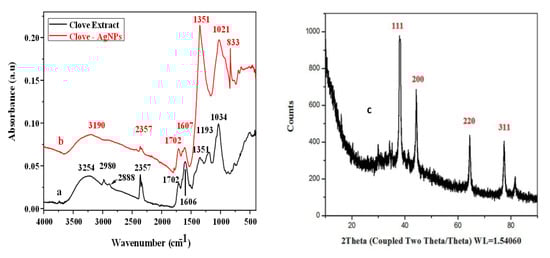 To study the interaction of clove extract with AgNPs and the crystalline nature of the AgNPs, FTIR spectroscopy and PXRD were performed (Figure 2). The FTIR results (Figure 2a,b) confirm the interaction of clove extract with AgNPs. Clove extract contains several organic compounds; eugenol is a major component, and it can act as a reducing agent, yielding nanoparticles. The peak at 3254 cm−1 in the FTIR spectrum of clove extract is attributed to the –OH group and the intense peak at 1034 cm−1 is attributed to the –CO functional group. In addition, the spectrum of clove extract contains various small peaks. As shown in Figure 2a, after the interaction of clove extract with AgNPs (Figure 2b), some bands disappear, and new bands appear. The appearance of a new broad, intense band at 1351 cm−1, which was absent in clove extract spectrum, indicates the formation of AgNPs and their interaction with reagents present in the clove extract. Signals at 2357 cm−1 (perhaps due to the possibility of CO2 contamination described at 2350 cm−1 [33]), 1702 cm−1, 1606 cm−1, and 1351 cm−1 in Figure 2a are repeated in Figure 2b but with changed absorbance due the interaction of the clove extract with AgNPs. The low signal at 1193 cm−1 in Figure 2a is absent due to intensification of peak at 1351 cm−1 in Figure 2b perhaps from overlapping.