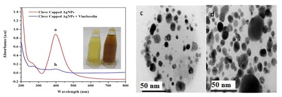 As previously reported, the clove-AgNPs exhibited an LSPR band in the wavelength range of 380–450 nm [36]. However, after the addition of VIN (16 µM), the LSPR band intensity significantly decreases and the color of the AgNP solution changes from yellow to dark brown, as shown in the inset in Figure 3. Moreover, the addition of VIN leads to the formation of aggregates, as is evident from Figure 3c,d. Compared to the AgNPs after interaction with VIN (Figure 3b,d), those before the interaction (Figure 3a,c) are smaller because of the presence of capping molecules present in the clove extract; after VIN addition, AgNPs form aggregates, as indicated by a decrease in the absorbance and red shift in the absorption peak.