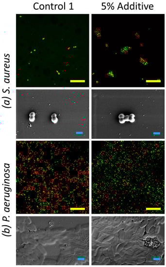 Attachment patterns and viability of (a) Gram-positive S. aureus and (b) Gram-negative P. aeruginosa bacterial cells on the Control 1 and Control 1 samples containing the 5% additives. Confocal laser scanning microscopy (CLSM) micrographs (green indicating viable cells, and red indicating non-viable cells) highlighed the viable and non-viable bacterial cells on these surfaces (scale bar 20 µm). Scanning electron micrographs (bottom) display the morphology of bacterial cells on these surfaces (scale bar 1 µm).